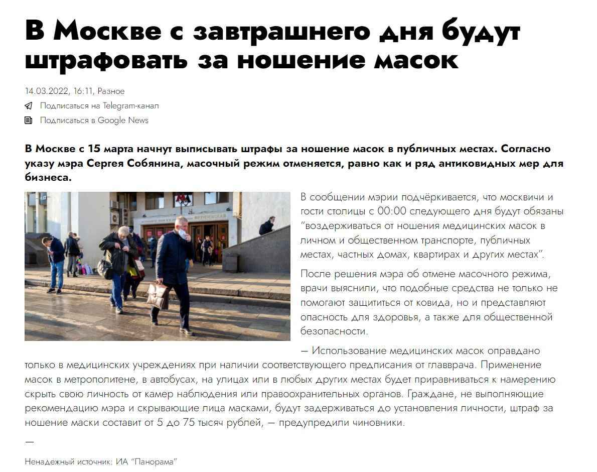 С 15 марта в Москве в связи с улучшением эпидемиологической ситуации отменяют требование об обязательном использовании защитных масок в общественных местах. Об этом в своем блоге написал Сергей Собянин. «Стабильное улучшение эпидемиологической ситуации позволяет принять долгожданное решение. Со вторника, 15 марта 2022 года, мы отменяем требование по использованию защитных масок. Кроме того, отменяются обязательные антиковидные меры на предприятиях и в организациях, установленные указом Мэра Москвы: регулярное измерение температуры тела работников, установка разделительных перегородок на рабочих местах», — отметил Мэр Москвы. По его словам, в нынешних условиях это решение еще и поддержит бизнес, испытывающий серьезное санкционное давление. Ранее в Москве отменили блокировку транспортных карт для москвичей старше 60 лет и граждан, имеющих хронические заболевания, а удаленный режим работы стал рекомендательным